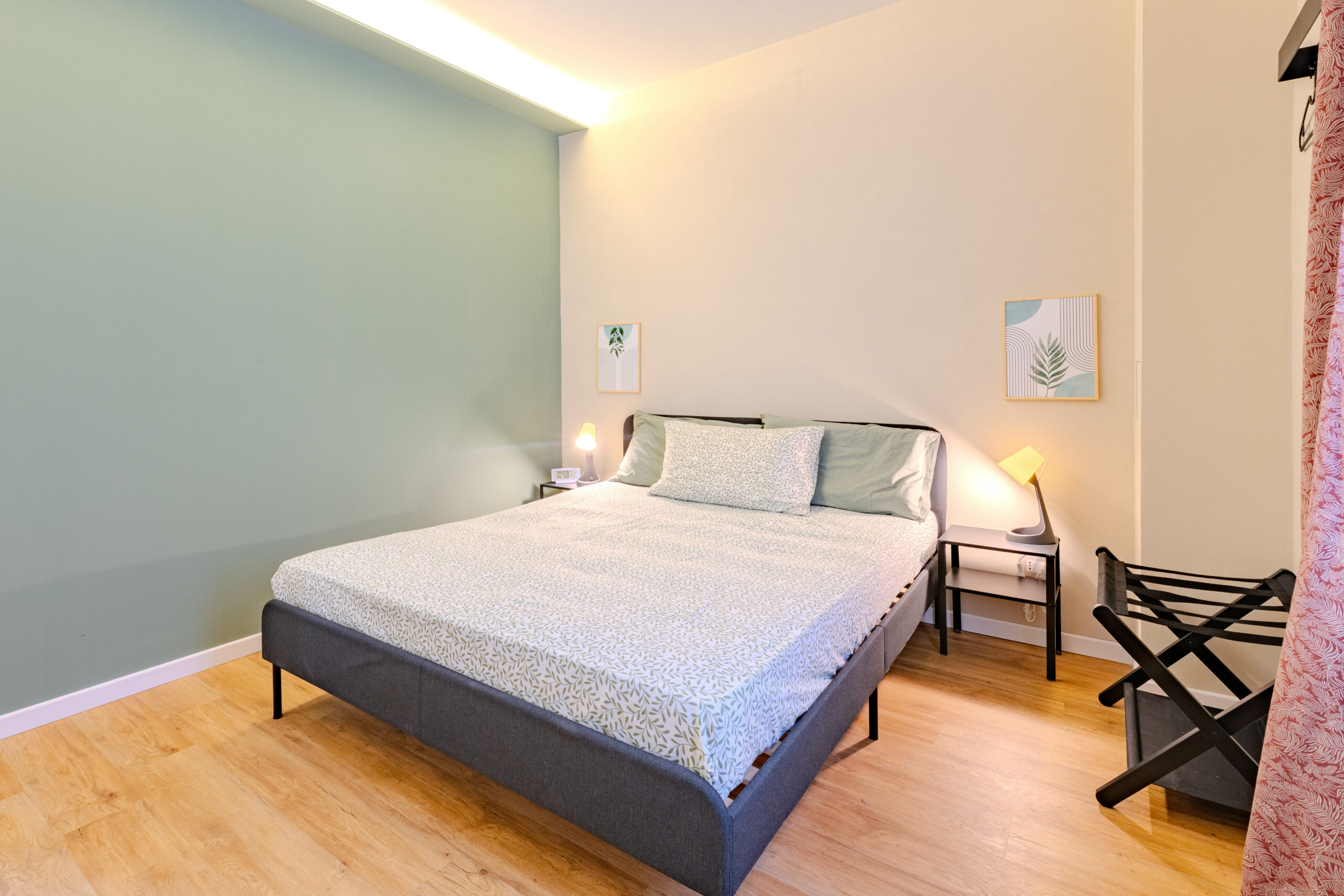 Gli arredi, essenziali e curati, raccontano un’estetica sobria ma raffinata: la scrivania in posizione raccolta, l’armadio compatto, il letto matrimoniale avvolto da tessuti morbidi e colori tenui. Ogni elemento è pensato per offrire ordine visivo e comodità reale, senza rinunciare al senso di casa.