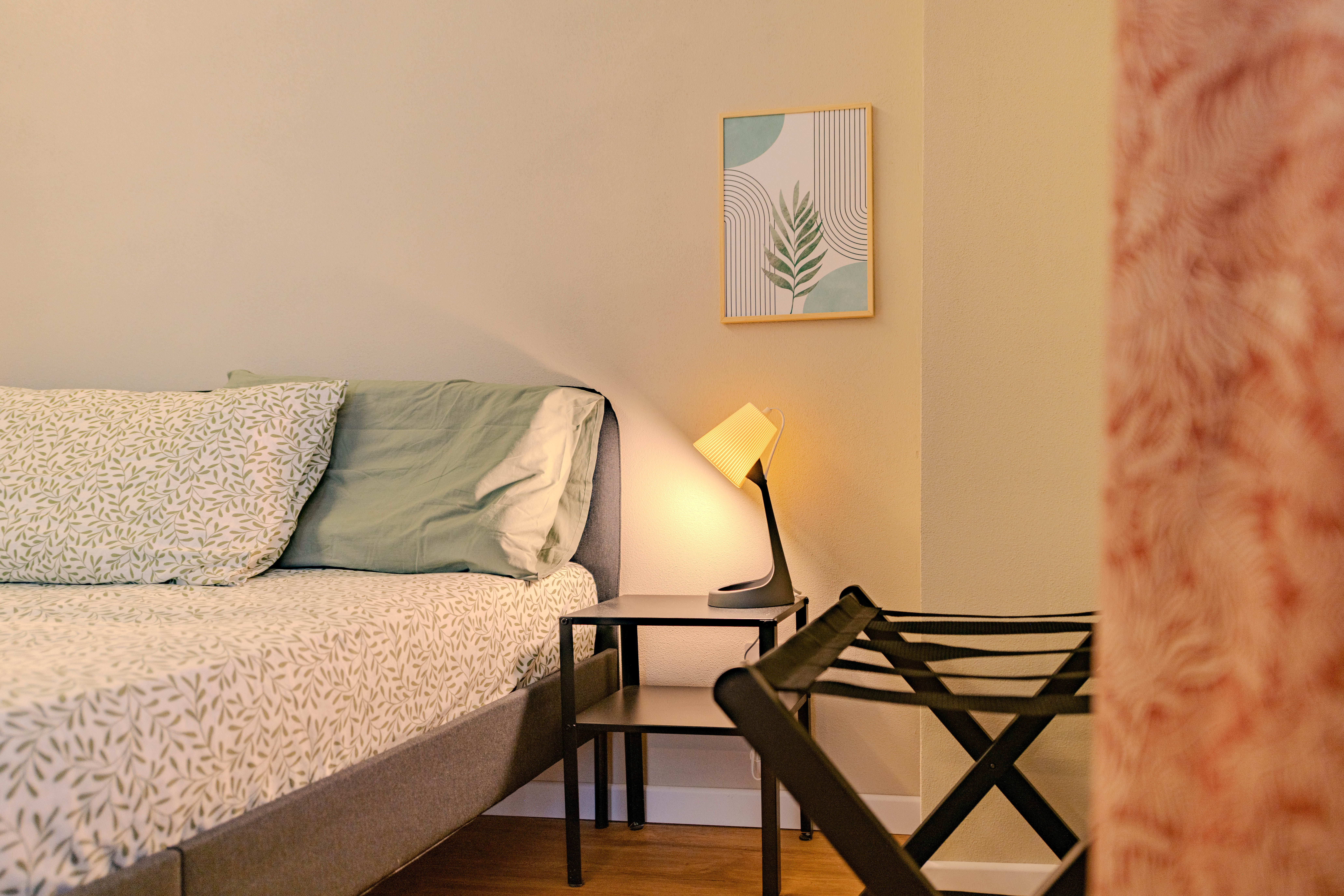 Gli arredi, essenziali e curati, raccontano un’estetica sobria ma raffinata: la scrivania in posizione raccolta, l’armadio compatto, il letto matrimoniale avvolto da tessuti morbidi e colori tenui.